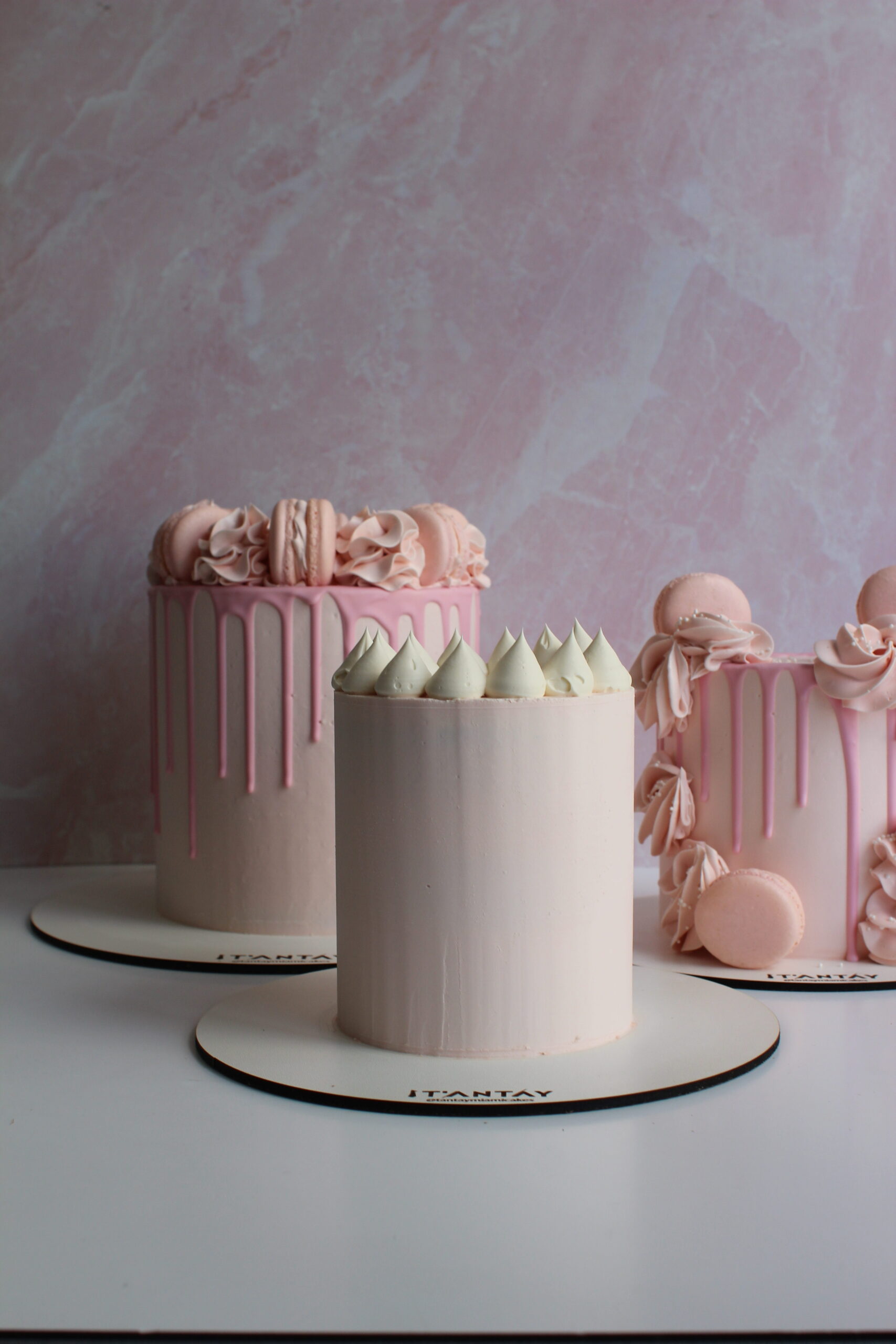 The Drip and Macaroons Cake features a refined monochrome buttercream finish, elegant drip detailing, and decorative macarons placed as shown. This design is offered as a curated style with a polished, elevated look.